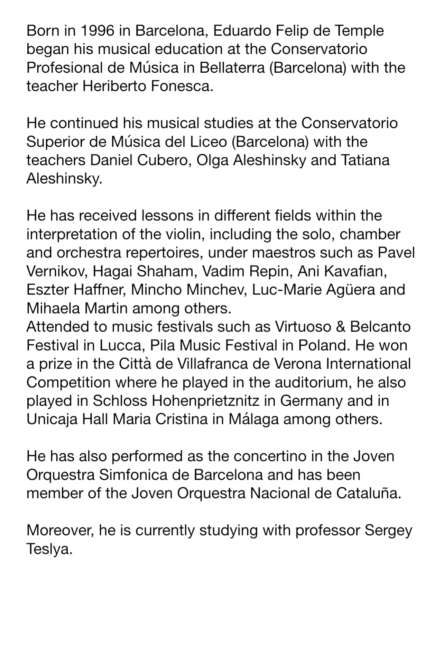 Born in 1996 in Barcelona, Eduardo Felip de Temple began his musical education at the Conservatorio Profesional de Música in Bellaterra (Barcelona) with the teacher Heriberto Fonesca.