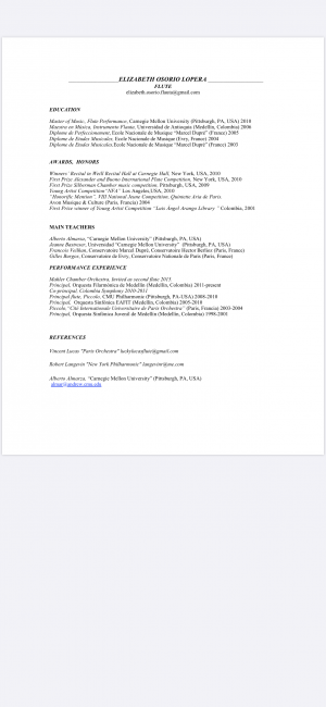 Ms Osorio is currently first flute of Medellin Philarmonic, She is working in Colombia as faculty member at the Antioquia University, where she has taught since 2006. Ms Osorio made her debut at Carnegie hall of New York in 2010, she has been invited to perform with the Mahler Chamber Orchestra in 2015 and she has colaborated as a co-principal flute with the National Symphony Orchestra of Colombia.